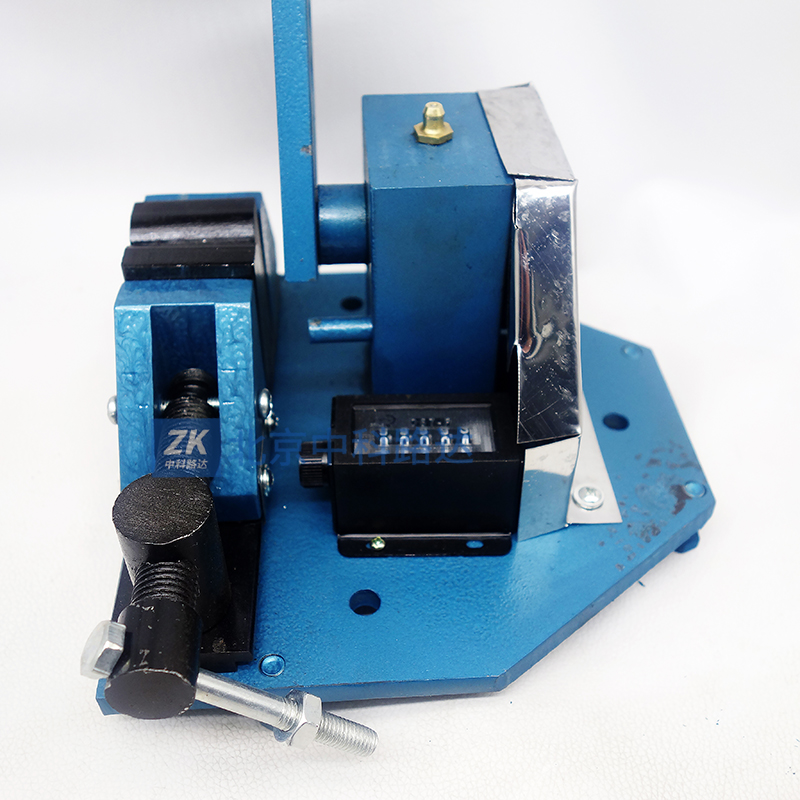 4、將搖臂處于垂直位置,并以此作為試驗的起始狀態(tài)將試樣先穿入兩夾片中底板的孔內(nèi)。然后垂直向上從撥桿的下部穿過撥桿孔,再穿入上夾頭至頂部,轉(zhuǎn)動上夾頭手柄把線材上端夾緊