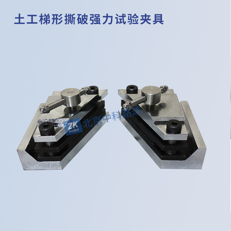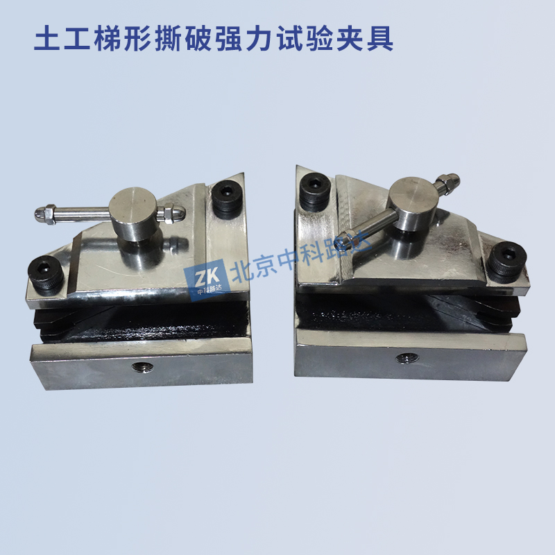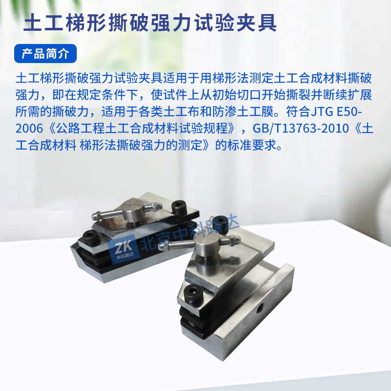 土工梯形撕破強(qiáng)力試驗(yàn)夾具適用于用梯形法測定土工合成材料撕破強(qiáng)力,即在規(guī)定條件下,使試件上從初始切口開始撕裂并斷續(xù)擴(kuò)展所需的撕破力,適用于各類土工布和防滲土工膜。符合JTG E50-2006《公路工程土工合成材料試驗(yàn)規(guī)程》,GB/T13763-2010《土工合成材料 梯形法撕破強(qiáng)力的測定》的標(biāo)準(zhǔn)要求。