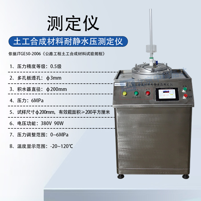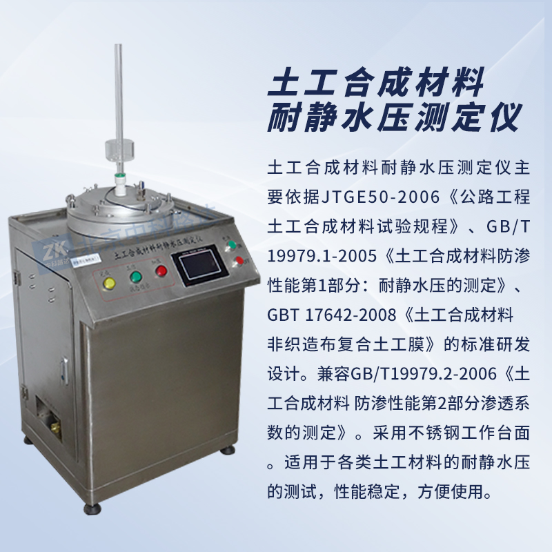 土工合成材料耐靜水壓測定儀主要依據(jù)JTGE50-2006《公路工程土工合成材料試驗(yàn)規(guī)程》、GB/T 19979.1-2005《土工合成材料防滲性能第1部分:耐靜水壓的測定》、GBT 17642-2008《土工合成材料 非織造布復(fù)合土工膜》的標(biāo)準(zhǔn)研發(fā)設(shè)計(jì)。兼容GB/T 19979.2-2006《土工合成材料 防滲性能第2部分滲透系數(shù)的測定》。采用不銹鋼工作臺(tái)面。適用于各類土工材料的耐靜水壓的測試,性能穩(wěn)定,方便使用。
