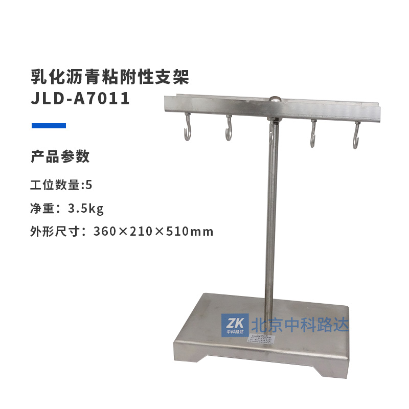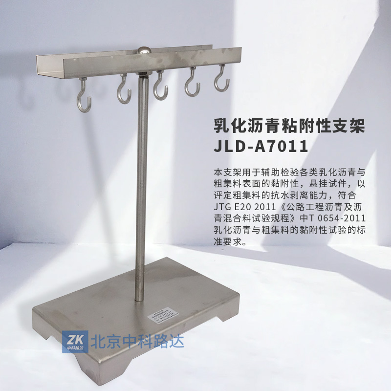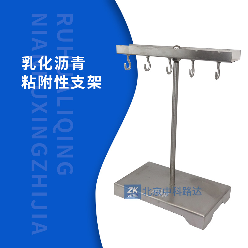 本支架用于輔助檢驗各類乳化瀝青與粗集料表面的黏附性,懸掛試件,以評定粗集料的抗水剝離能力,符合JTG E20 2011《公路工程瀝青及瀝青混合料試驗規(guī)程》中T 0654-2011 乳化瀝青與粗集料的黏附性試驗的標(biāo)準(zhǔn)要求。