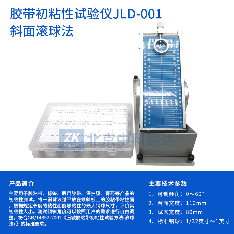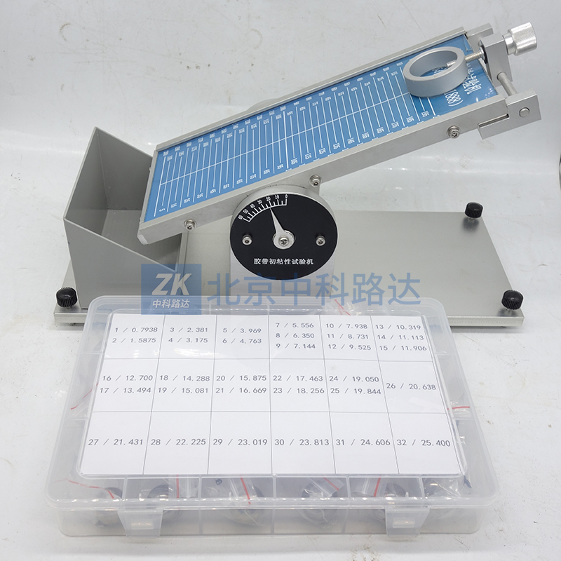 主要用于膠粘帶、標(biāo)簽、醫(yī)用膠帶、保護(hù)膜、膏藥等產(chǎn)品的初粘性測(cè)試。將一鋼球滾過(guò)平放在傾斜板上的膠粘帶粘性面,根據(jù)規(guī)定長(zhǎng)度的粘性面能夠粘住的最大鋼球尺寸,評(píng)價(jià)其初粘性大小。測(cè)試傾斜角度可以按照用戶(hù)的需求進(jìn)行自由調(diào)整。符合GB/T4852-2002《壓敏膠粘帶初粘性試驗(yàn)方法(滾球法) 》的標(biāo)準(zhǔn)要求。