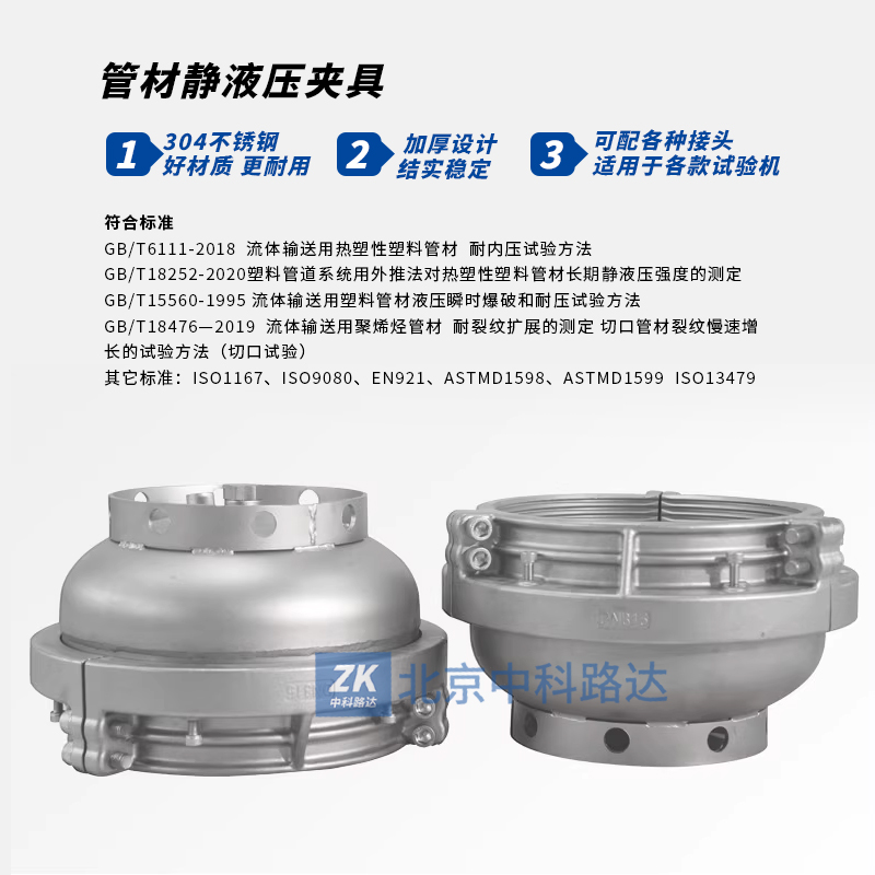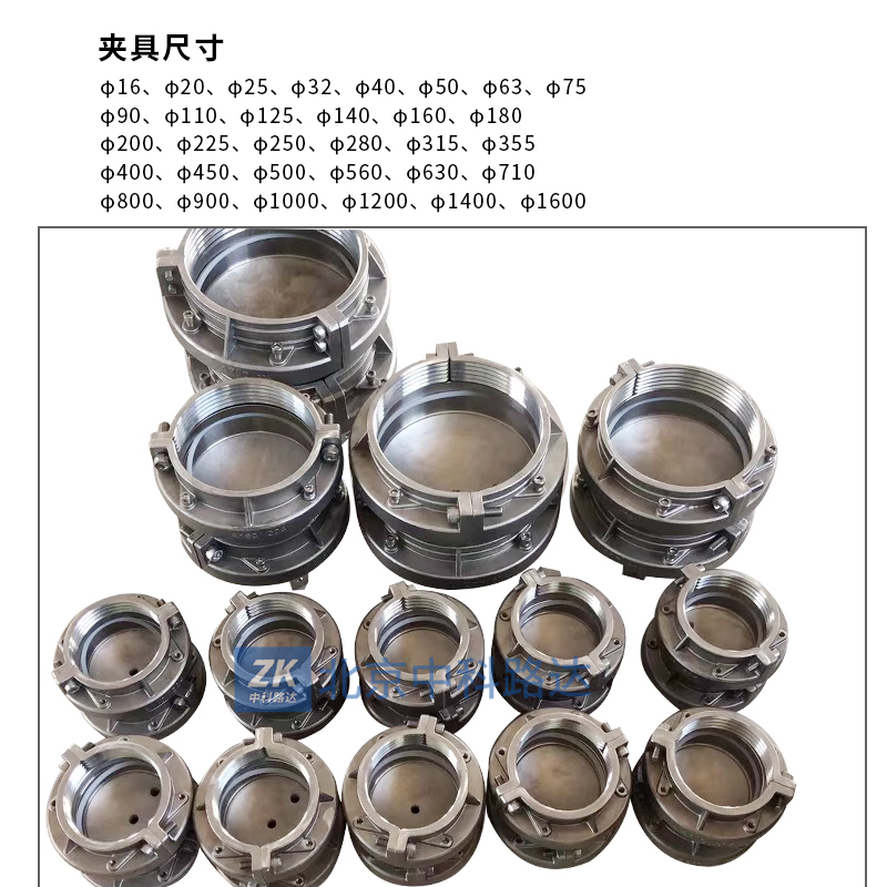 管材靜液壓夾具主要用于液壓測試試驗(yàn)和負(fù)壓測試試驗(yàn)。采用304不銹鋼材料精加工制造,加大加厚,無拉桿徑向密封,可適用于PVC、PE、PPR、內(nèi)襯鋼骨架復(fù)合等各種管材管件的端部密封,該夾具主要由夾緊塊、橢圓端頭、硅膠密封圈、壓圈等零部件組成??膳鋫涓鞣N接頭及高壓管與各個品牌試驗(yàn)機(jī)連接。