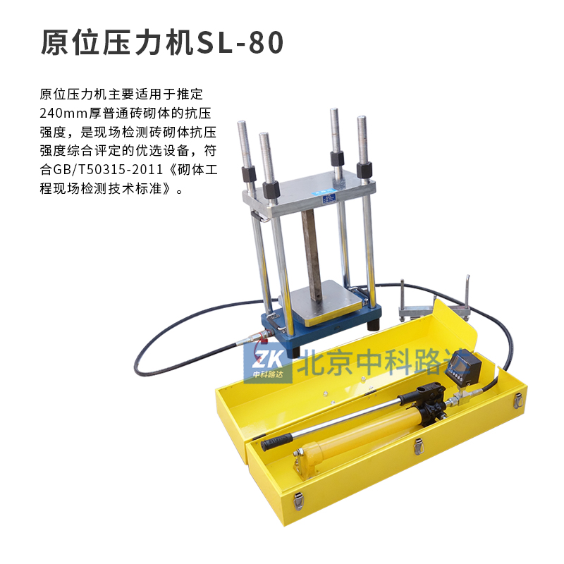 原位壓力機(jī)主要適用于推定240mm厚普通磚砌體的抗壓強(qiáng)度,是現(xiàn)場(chǎng)檢測(cè)磚砌體抗壓強(qiáng)度綜合評(píng)定的優(yōu)選設(shè)備,符合GB/T50315-2011《砌體工程現(xiàn)場(chǎng)檢測(cè)技術(shù)標(biāo)準(zhǔn)》。