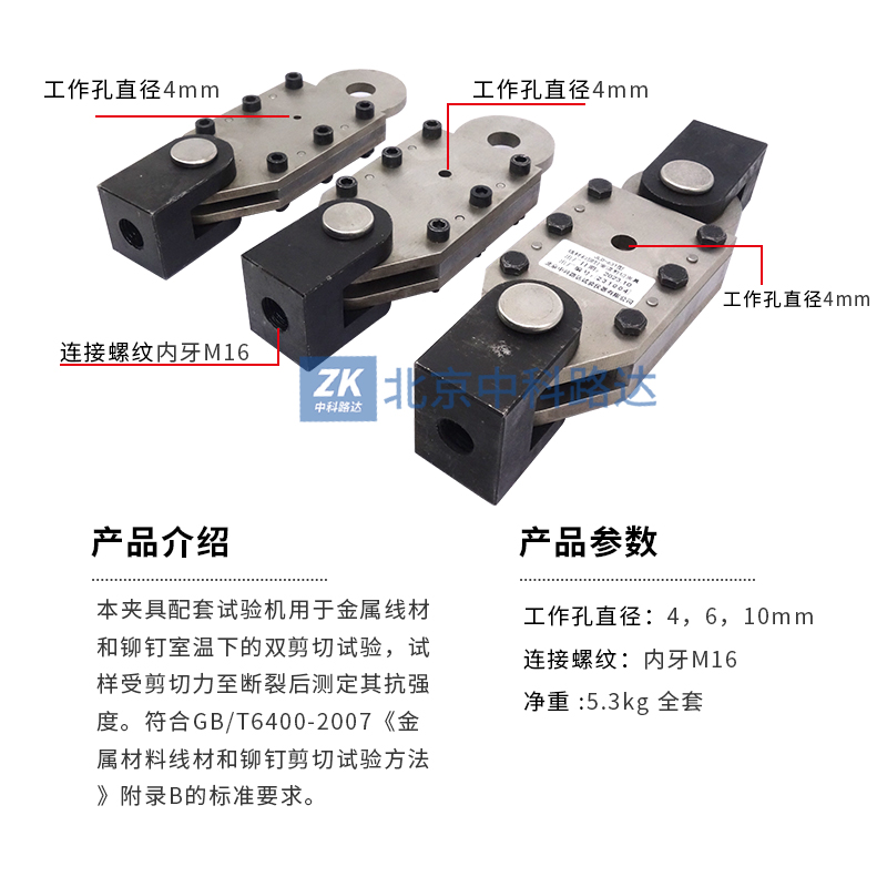 本夾具配套試驗(yàn)機(jī)用于金屬線材和鉚釘室溫下的雙剪切試驗(yàn),試樣受剪切力至斷裂后測(cè)定其抗強(qiáng)度。符合GB/T6400-2007《金屬材料線材和鉚釘剪切試驗(yàn)方法》附錄B的標(biāo)準(zhǔn)要求。