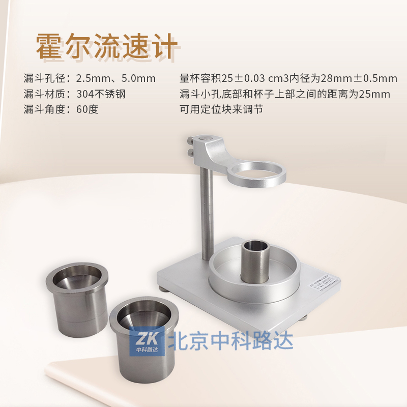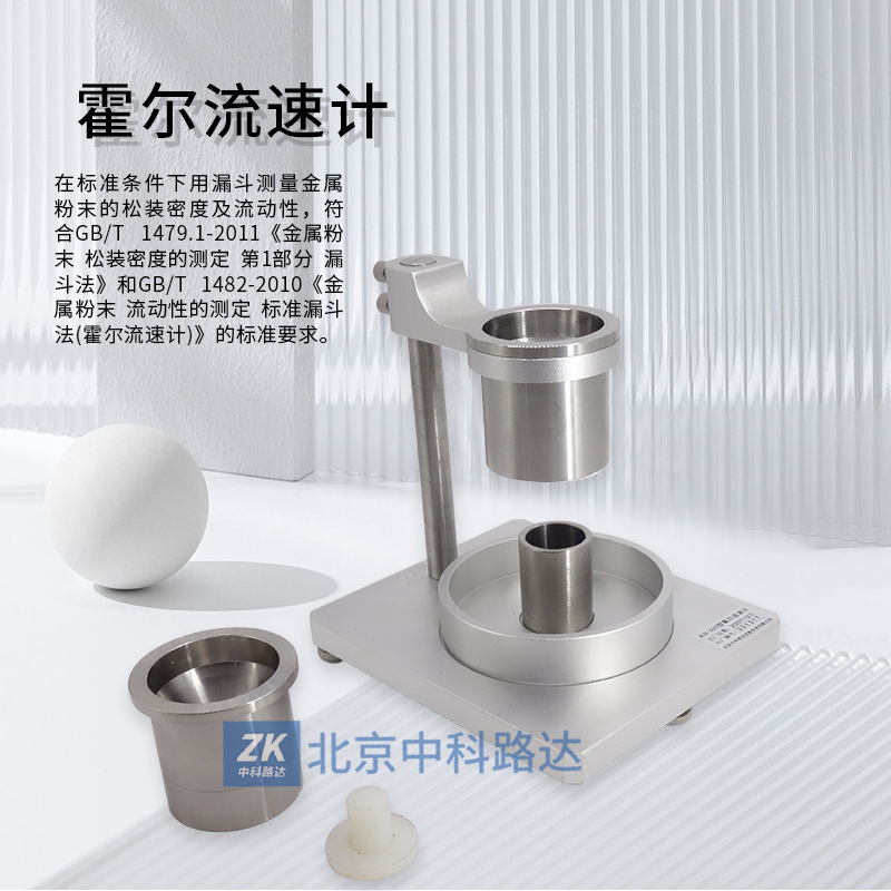在標(biāo)準(zhǔn)條件下用漏斗測(cè)量金屬粉末的松裝密度及流動(dòng)性,符合GB/T 1479.1-2011《金屬粉末 松裝密度的測(cè)定 第1部分 漏斗法》和GB/T 1482-2010《金屬粉末 流動(dòng)性的測(cè)定 標(biāo)準(zhǔn)漏斗法(霍爾流速計(jì))》的標(biāo)準(zhǔn)要求。