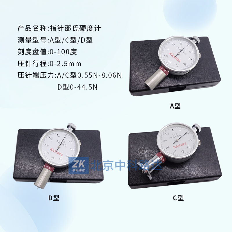 邵氏橡膠硬度計(jì)是測定硫化橡膠和塑料制品硬度的儀器,該儀器有A型、D型、C型三種形式。