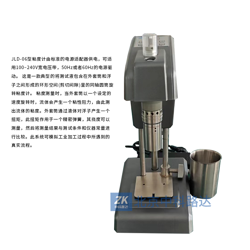 JLD-06型粘度計(jì)由標(biāo)準(zhǔn)的電源適配器供電,可適用100~240V寬電壓帶,50Hz或者60Hz的電源驅(qū)動(dòng)。 這是一款典型的將測(cè)試液包含在外套筒和浮子之間形成的環(huán)形空間(剪切間隙)里的同軸圓筒旋轉(zhuǎn)粘度計(jì)。 粘度測(cè)量時(shí),當(dāng)外套筒以一個(gè)設(shè)定的速度旋轉(zhuǎn)時(shí),流體會(huì)產(chǎn)生一個(gè)粘性阻力,由此測(cè)出流體的粘度。外套筒通過(guò)液體對(duì)浮子產(chǎn)生一個(gè)扭矩,此扭矩作用于一個(gè)精密彈簧,其撓度可以測(cè)量,然后將測(cè)量結(jié)果與測(cè)試條件和儀器常量進(jìn)行比較。此系統(tǒng)可模擬工業(yè)加工過(guò)程中所遇到的真實(shí)流程。