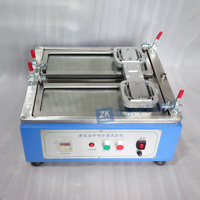 耐污漬試驗(yàn)儀用于實(shí)驗(yàn)室評(píng)價(jià)內(nèi)墻涂料的耐污漬性能。不同的涂料干膜表面在受到污染后,污漬從干膜表面去除的難易程度不同,這種難易程度反映了干膜表面的耐污漬能力,即耐污漬性。目前使用較多的測(cè)試方法是基于ASTM D4828和GB/T9780-2013標(biāo)準(zhǔn),將涂膜刮在黑色塑料片上在標(biāo)準(zhǔn)狀態(tài)下養(yǎng)護(hù)7天,測(cè)試干膜的反射系數(shù)后再在干膜上涂布污漬,一定時(shí)間后在耐污漬試驗(yàn)機(jī)上擦洗一定次數(shù),然后沖洗晾干涂膜,測(cè)試擦洗區(qū)域的反射系數(shù)。通過對(duì)比前后二次的反射系數(shù)來評(píng)價(jià)涂膜的耐污漬性能。本機(jī)為雙磨頭組件配置。