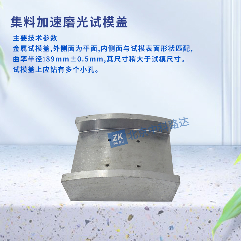 6、試模蓋金屬試模蓋,外側面為平面,內(nèi)側面與試模表面形狀匹配,曲率半徑189mm±0.5mm,其尺寸稍大于試模尺寸。試模蓋上應鉆有多個小孔。