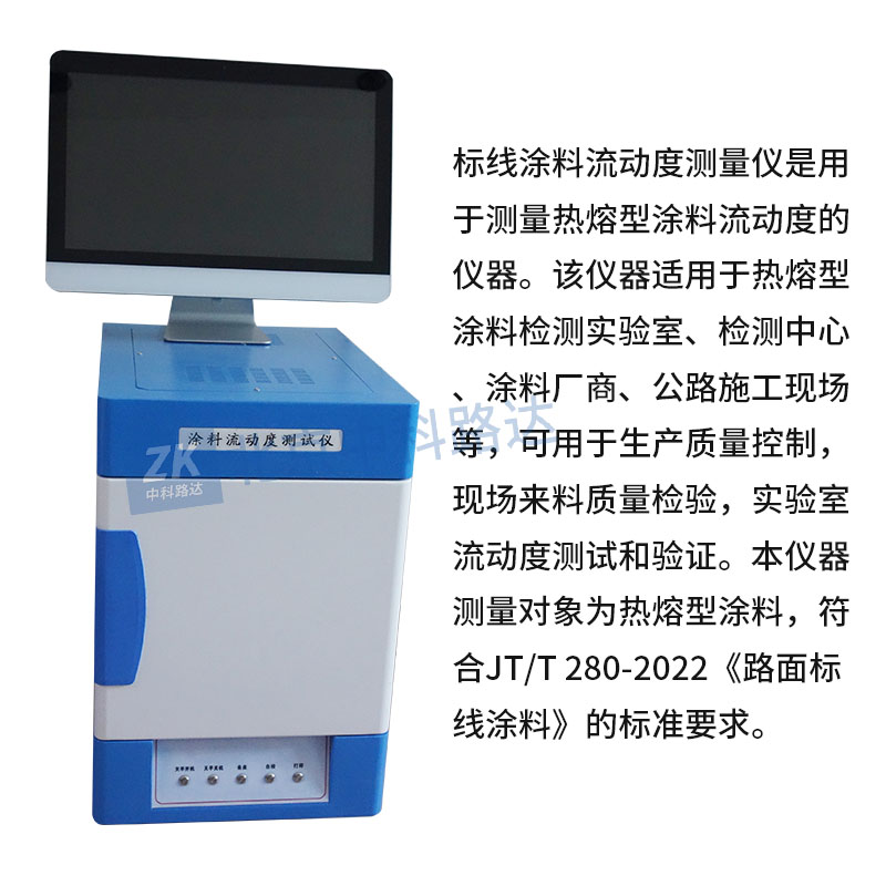 標(biāo)線涂料流動(dòng)度測量儀是用于測量熱熔型涂料流動(dòng)度的儀器。該儀器適用于熱熔型涂料檢測實(shí)驗(yàn)室、檢測中心、涂料廠商、公路施工現(xiàn)場等,可用于生產(chǎn)質(zhì)量控制,現(xiàn)場來料質(zhì)量檢驗(yàn),實(shí)驗(yàn)室流動(dòng)度測試和驗(yàn)證。本儀器測量對象為熱熔型涂料,符合JT/T 280-2022《路面標(biāo)線涂料》的標(biāo)準(zhǔn)要求。
