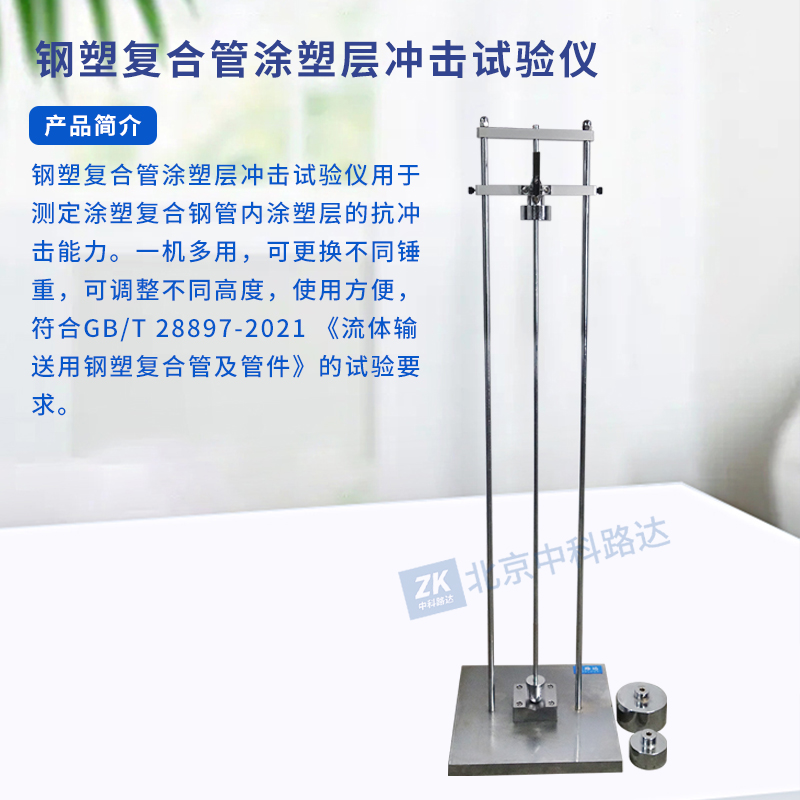 鋼塑復合管涂塑層沖擊試驗儀用于測定涂塑復合鋼管內涂塑層的抗沖擊能力。一機多用,可更換不同錘重,可調整不同高度,使用方便,符合GB/T 28897-2021 《流體輸送用鋼塑復合管及管件》的試驗要求。