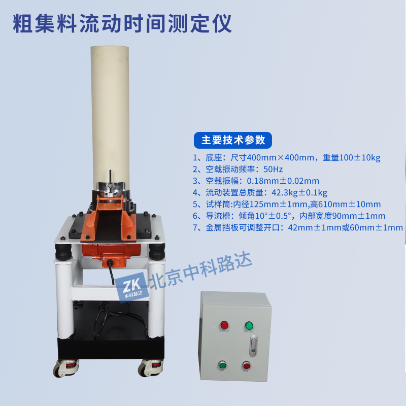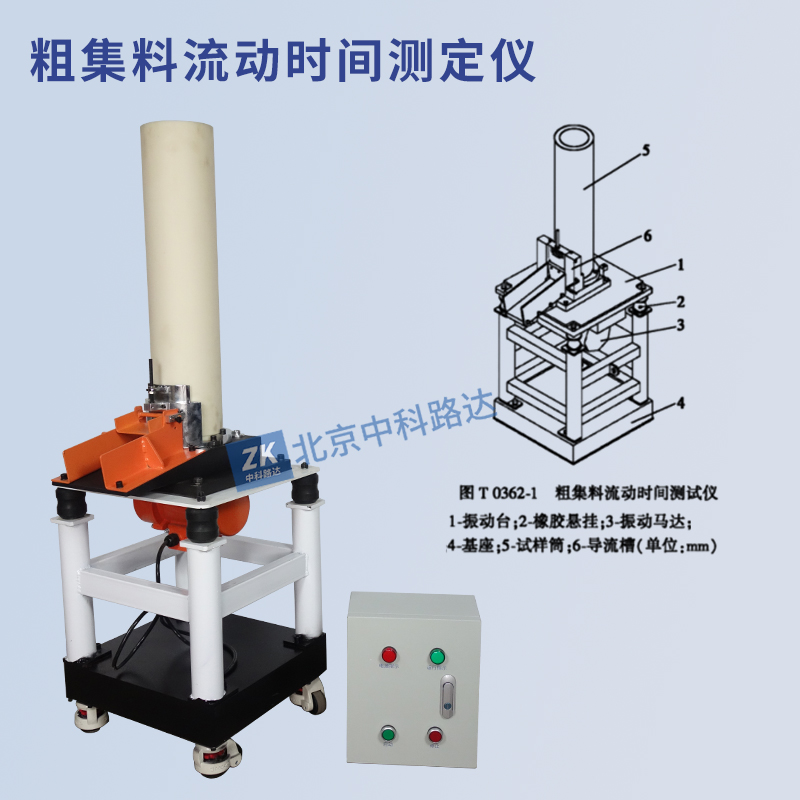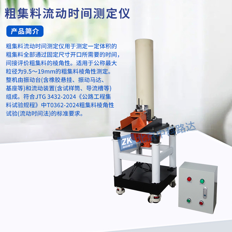 粗集料流動時間測定儀用于測定一定體積的粗集料全部通過固定尺寸開口所需要的時間,間接評價粗集料的棱角性。適用于公稱最大粒徑為9.5~19mm的粗集料棱角性測定整機由振動臺(含橡膠懸掛、振動馬達、基座等)和流動裝置(含試樣筒、導(dǎo)流槽等)組成。符合JTG 3432-2024《公路工程集料試驗規(guī)程》T0362-2024粗集料棱角性試驗(流動時間法)的標(biāo)準(zhǔn)要求。