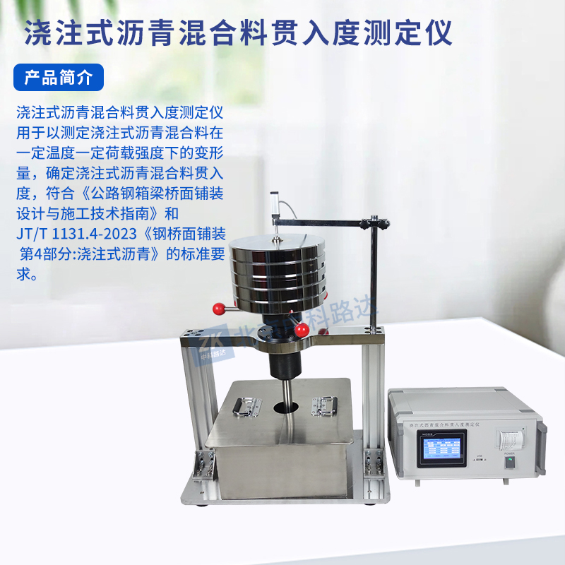 澆注式瀝青混合料貫入度測(cè)定儀用于以測(cè)定澆注式瀝青混合料在一定溫度一定荷載強(qiáng)度下的變形量,確定澆注式瀝青混合料貫入度,符合《公路鋼箱梁橋面鋪裝設(shè)計(jì)與施工技術(shù)指南》和JT/T 1131.4-2023《鋼橋面鋪裝 第4部分:澆注式瀝青》的標(biāo)準(zhǔn)要求。