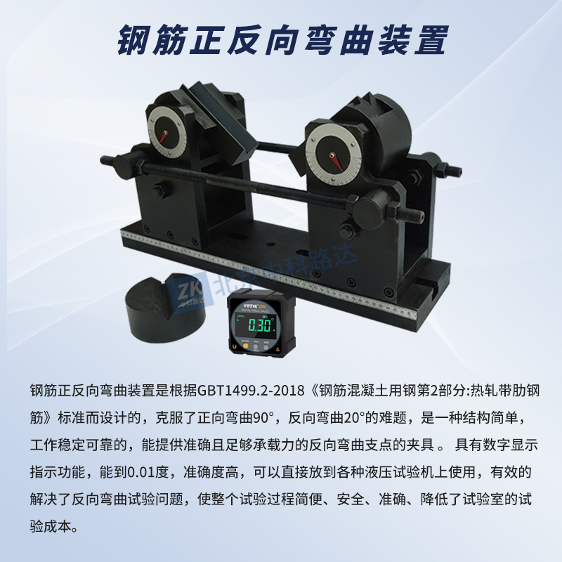 鋼筋正反向彎曲裝置是根據(jù)GBT1499.2-2018《鋼筋混凝土用鋼第2部分:熱軋帶肋鋼筋》標(biāo)準(zhǔn)而設(shè)計(jì)的,克服了正向彎曲90°,反向彎曲20°的難題,是一種結(jié)構(gòu)簡(jiǎn)單,工作穩(wěn)定可靠的,能提供準(zhǔn)確且足夠承載力的反向彎曲支點(diǎn)的夾具 。 具有數(shù)字顯示指示功能,能到0.01度,準(zhǔn)確度高,可以直接放到各種液壓試驗(yàn)機(jī)上使用,有效的解決了反向彎曲試驗(yàn)問(wèn)題,使整個(gè)試驗(yàn)過(guò)程簡(jiǎn)便、安全、準(zhǔn)確、降低了試驗(yàn)室的試驗(yàn)成本。