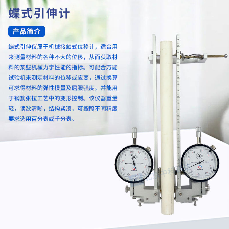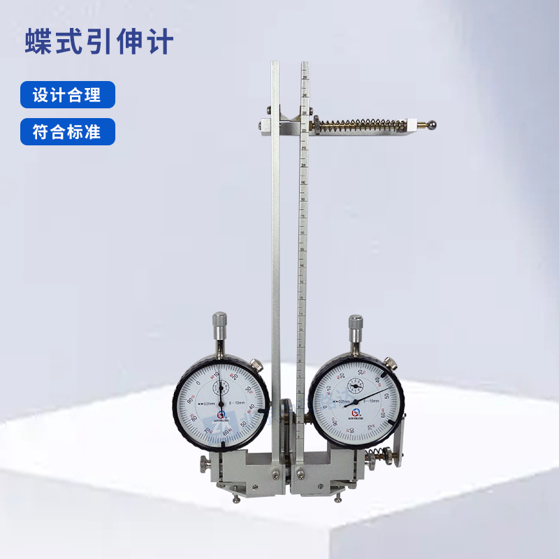 蝶式引伸儀屬機(jī)械接觸式移計(jì),適合用來測(cè)量材料的各種不大的位移,從而獲取材料的某些機(jī)械力學(xué)性能的指標(biāo)??膳浜先f能試驗(yàn)機(jī)來測(cè)定材料的位移或應(yīng)變,通過換算可求得材料的彈性模量及屈服強(qiáng)度。并能用于鋼筋張拉工藝中的變形控制。該儀器重量輕,讀數(shù)清晰,結(jié)構(gòu)緊湊,可按照不同精度要求選用百分表或千分表。