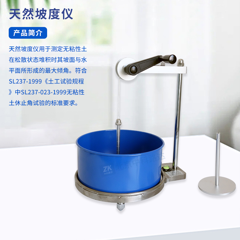 天然坡度儀用于測(cè)定無(wú)粘性土在松散狀態(tài)堆積時(shí)其坡面與水平面所形成的最大傾角。符合SL237-1999《土工試驗(yàn)規(guī)程》中SL237-023-1999無(wú)粘性土休止角試驗(yàn)的標(biāo)準(zhǔn)要求。