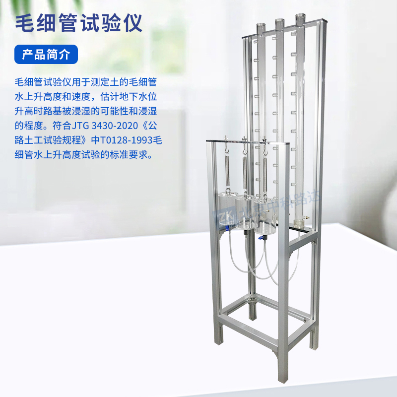 毛細管試驗儀用于測定土的毛細管水上升高度和速度,估計地下水位升高時路基被浸濕的可能性和浸濕的程度。符合JTG 3430-2020《公路土工試驗規(guī)程》中T0128-1993毛細管水上升高度試驗的標準要求。