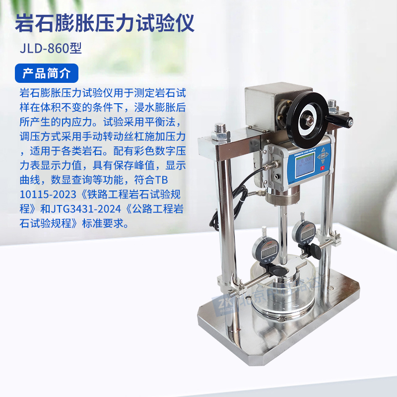 巖石膨脹壓力試驗(yàn)儀用于測(cè)定巖石試樣在體積不變的條件下,浸水膨脹后所產(chǎn)生的內(nèi)應(yīng)力。試驗(yàn)采用平衡法,調(diào)壓方式采用手動(dòng)轉(zhuǎn)動(dòng)絲杠施加壓力,適用于各類巖石。配有彩色數(shù)字壓力表顯示力值,具有保存峰值,顯示曲線,數(shù)顯查詢等功能,符合TB 10115-2023《鐵路工程巖石試驗(yàn)規(guī)程》和JTG3431-2024《公路工程巖石試驗(yàn)規(guī)程》標(biāo)準(zhǔn)要求。
